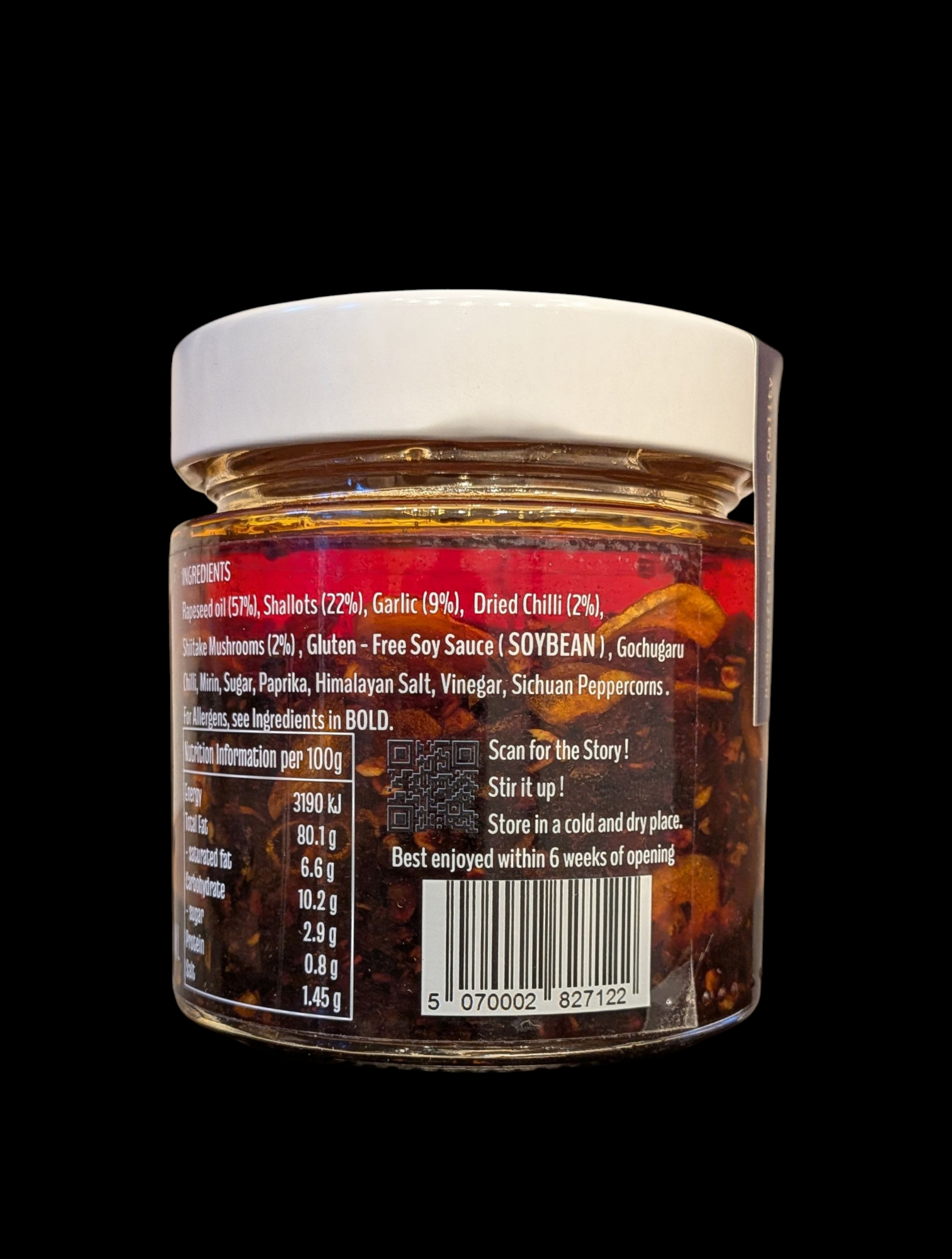 Rapeseed Oil (53%), Shallots (25%), Garlic (10%), Dried Chillies (5%), Shittake Mushrooms (2%), Soy Sauce ( SOYBEAN ) (2%), Gochugaru Pepper Chilli, Mirin Fu, Sugar, Paprika, Salt, Sichuan Peppercorns .